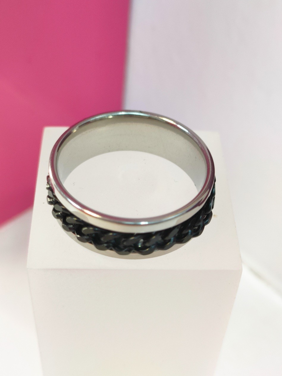 Anillo acero plateado con linea negra gruesa cadena T24