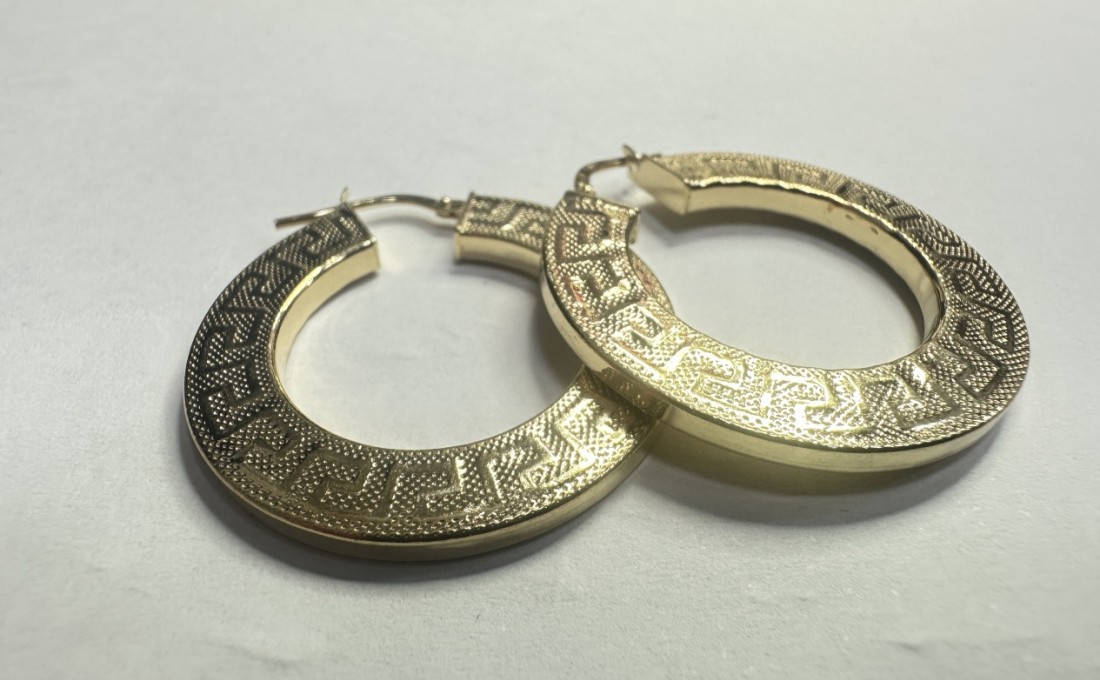 Pendiente tipo aro con greca de plata de ley 925 baño oro 18K, D 3,2cm